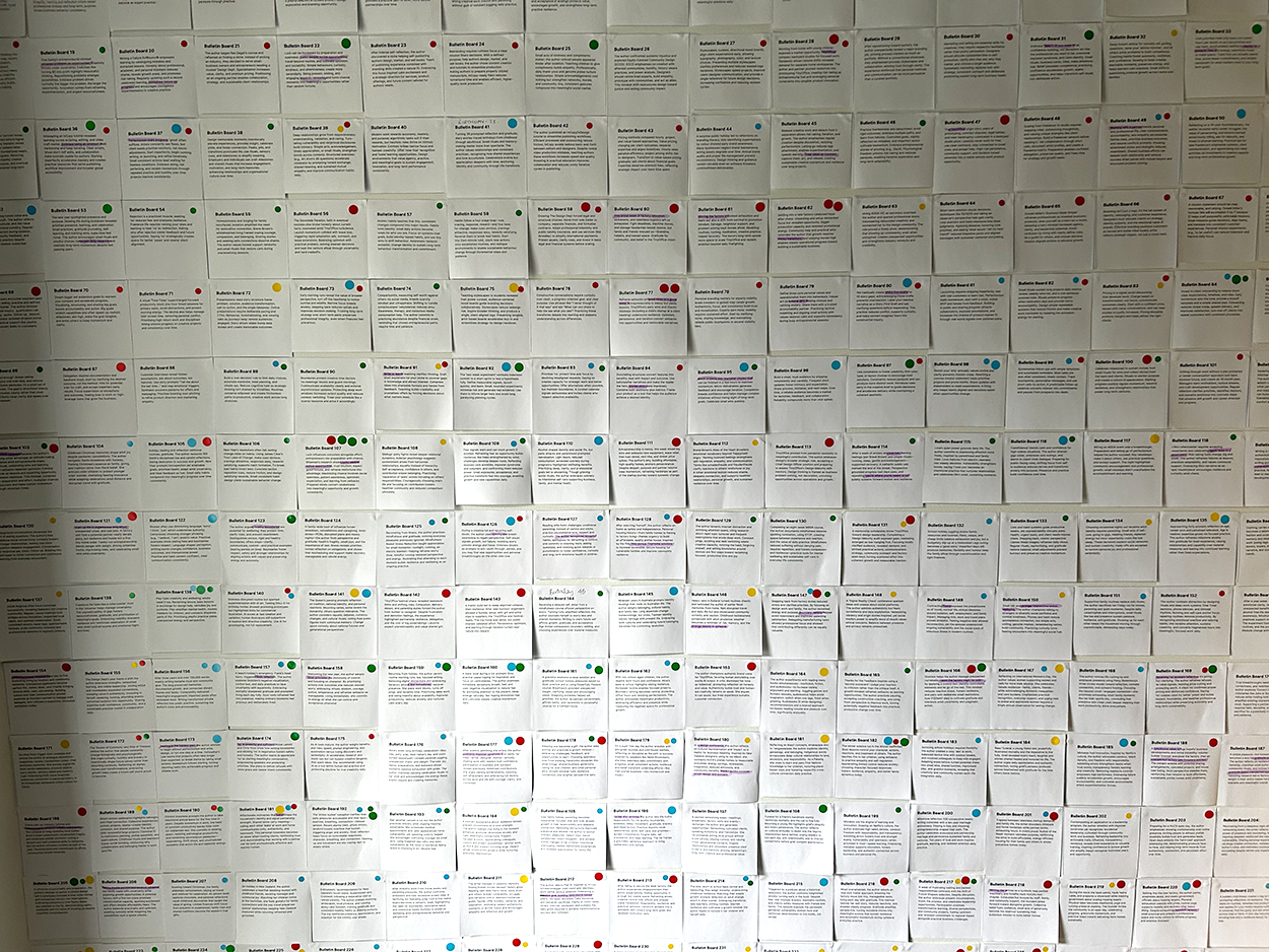 After three days of reading through my life, I used my dot stickers to plot my different categories. One of the first things I noted was how important people/networking has become. When I first started, I was running multiple businesses with a 3 and 4 year old within arms reach. It was still just Matt and myself. We had no employees and covid was about to hit. I wrote about work (red stickers) and lots about the stuff I was reading. During Covid I joined the AGDA Vic Council and jumped into a few online networking groups which was the start of me connecting with others (yellow stickers) outside of my immediate circle.