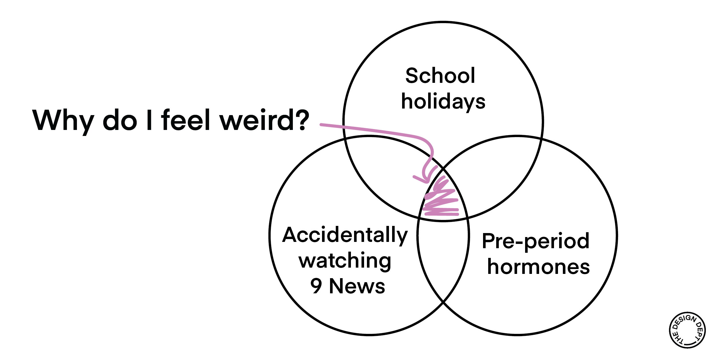 This leads me to the third part of my Venn diagram which is accidentally watching 9 News (commercial, free to air TV). What a downer. I’m all for staying up to date with the news but I chose to do this by reading the headlines on my phone when I have the time and headspace to do so. After only 2 minutes of 9 News I felt like we were all completely fucked.
