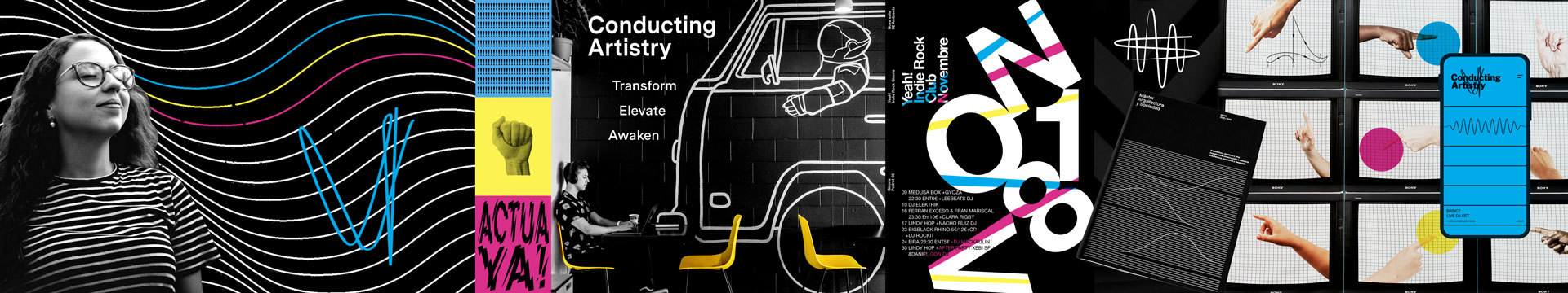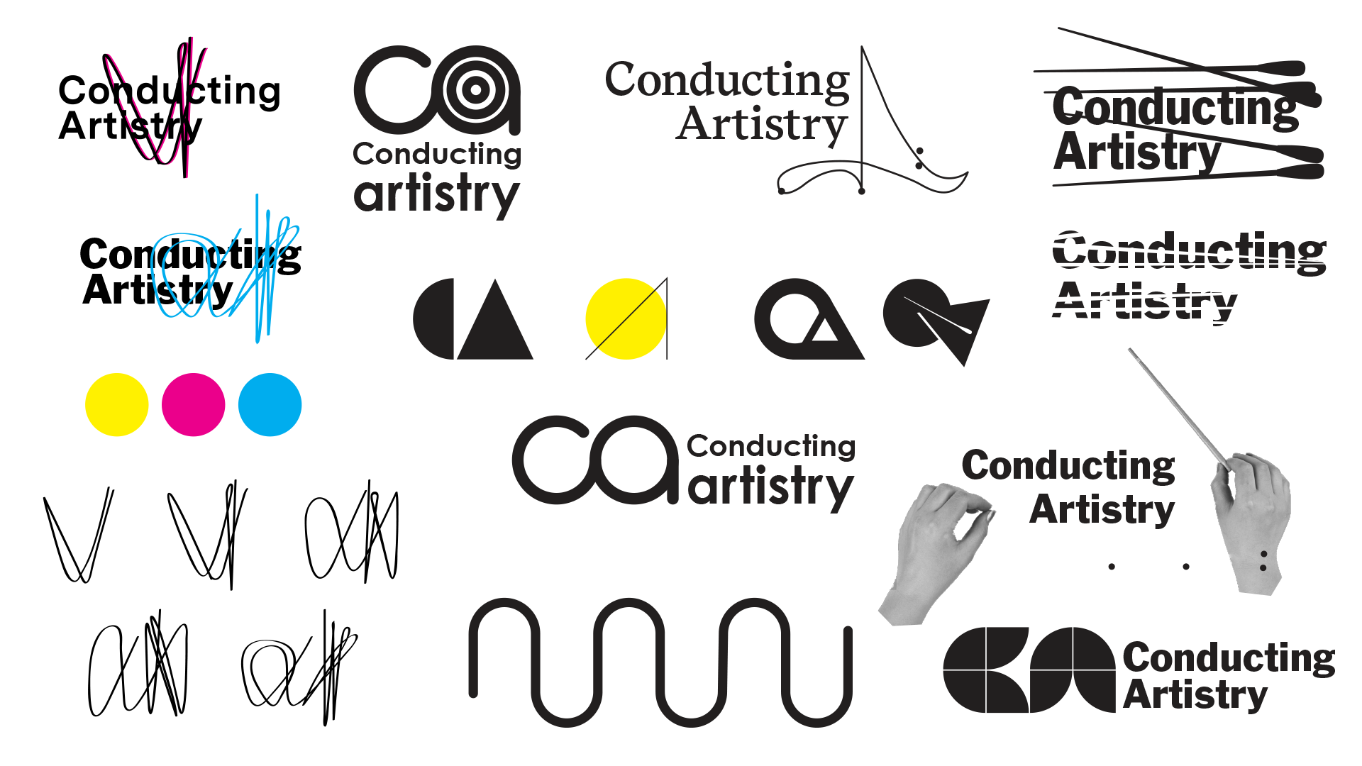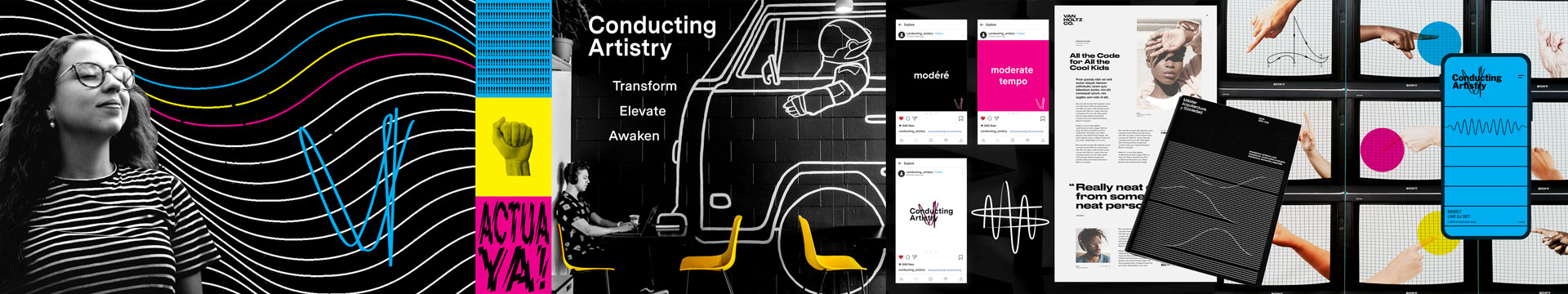 Renowned Melbourne conductor Ingrid Martin approached us in 2019 to help design and launch an online learning platform for conducting students. The mission was simple - to help students become the best conductor they could be. Wanting to disrupt the preconceived idea of who conductors are (old, white guys) Conducting Artistry flips the expected and uses reversed white on black where possible and is supported by super bright 100% CMYK! The identity system is inspired by the movement created by a Conductor’s baton and has several versions to be used throughout the school.